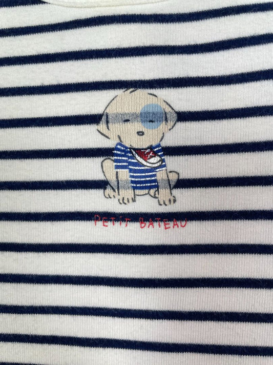 3 mo, Petit Bateau, White, Short-sleeve navy striped layered bodysuit w/ puppy