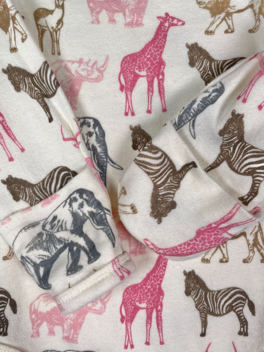 0-3 mo Touched by Nature, Cream, Organic cotton long-sleeve bodysuit, safari print w/ hand covers, pink/grey/brown
