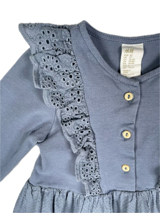 2/2T H&M, Blue, Long-sleeve dress, flower eyelet trim, ruffles at chest
