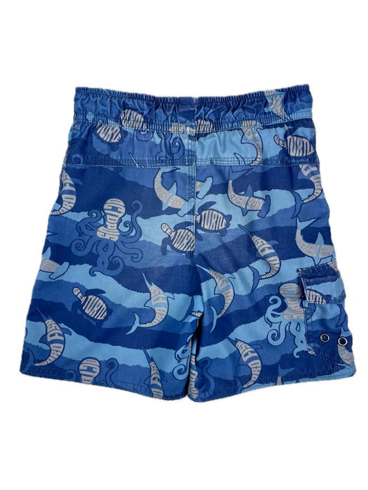 4/4T L.L.Bean, Blue, Sea creature / waves print elastic-waist swim trunks, decorative waist tie