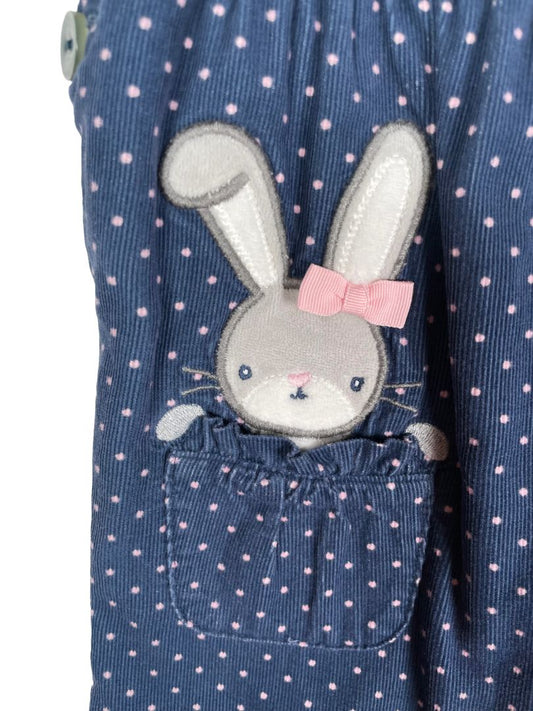 12-18 mo, Gymboree, Blue, Pink polka dot corduroy coverall, ruffle adjustable straps, bunny in pocket, snap legs