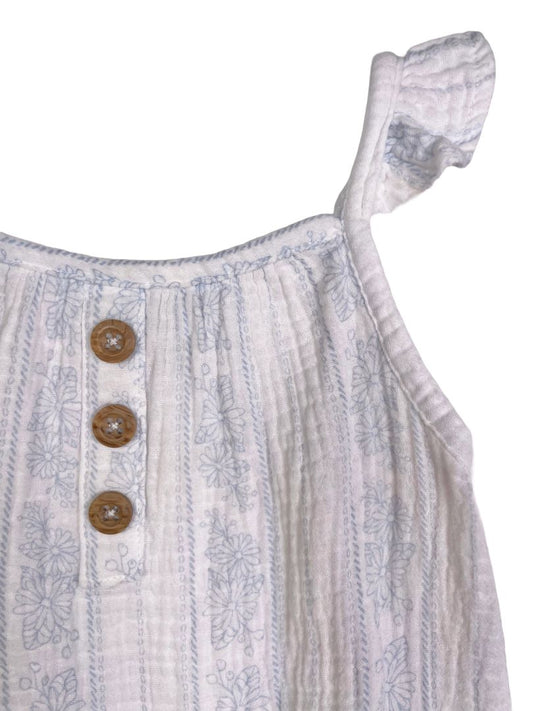 12 mo, Emily and Oliver, White, Gauzy ruffle strap romper, blue florals and verticals stripes