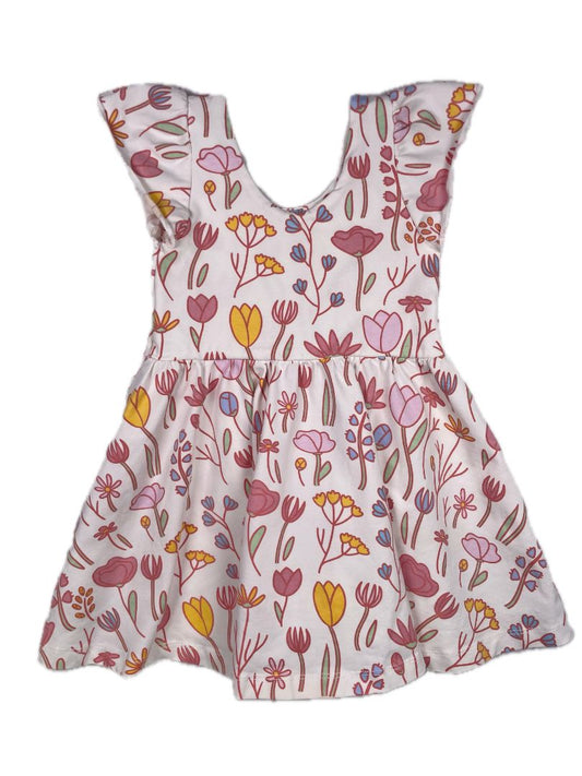 2/2T, Monica + Andy, White, Tulip/floral flutter-sleeve dress, organic cotton + stretch, pink/yellow/blue