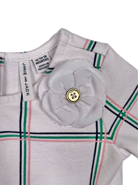 12-18 mo, Janie and Jack, White, Long-sleeve windowpane plaid dress w/ zippers, appliqué flower + bloomers SET