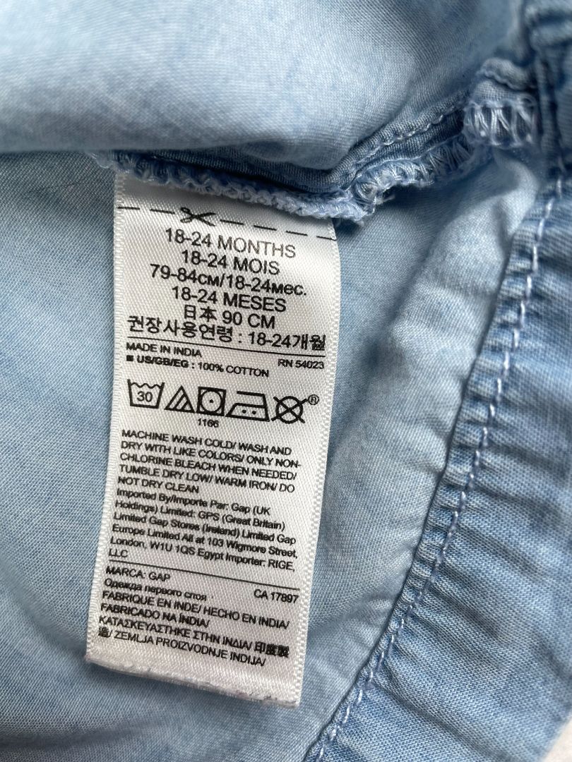 18-24 mo, babyGap, Blue, Chambray long-sleeve shirt, ruffles at shoulders