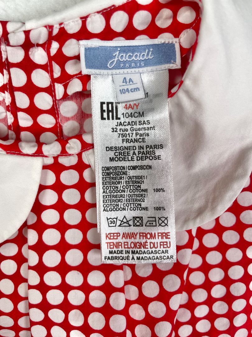 4/4T, Jacadi, Red, White polka dot long-sleeve cotton blouse, scallop peter pan collar
