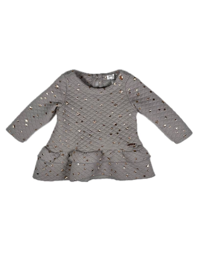 6-9 mo, Tahari, Grey, Quilted long-sleeve dress, metallic rose gold star print, ruffle bottom
