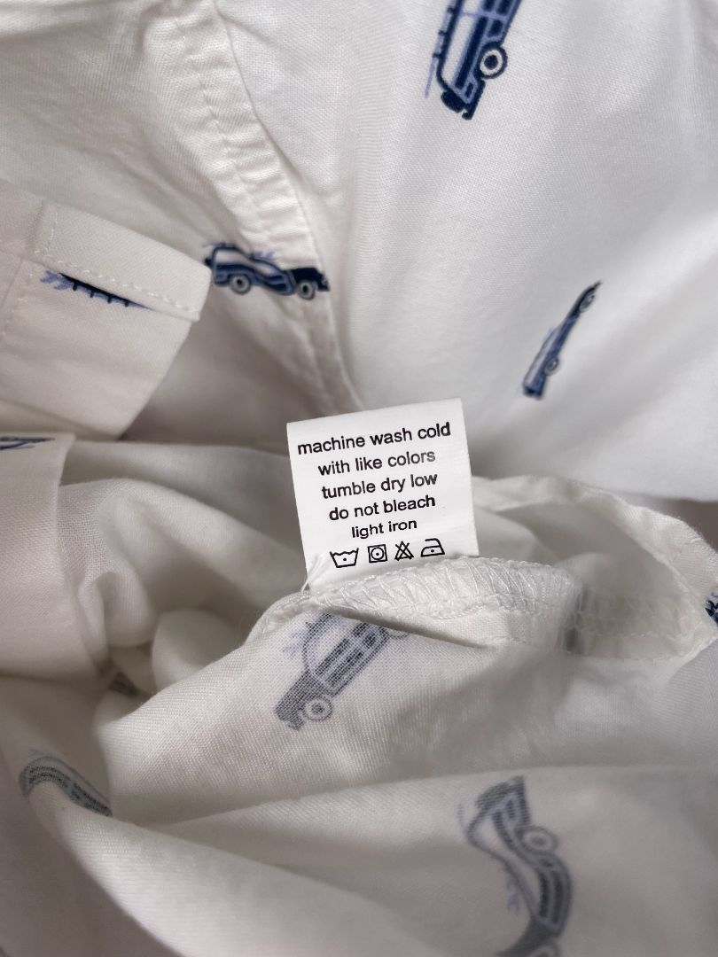 9-12 mo, Monica + Andy, White, Organic cotton button-up shirt, car w/ surfboard print